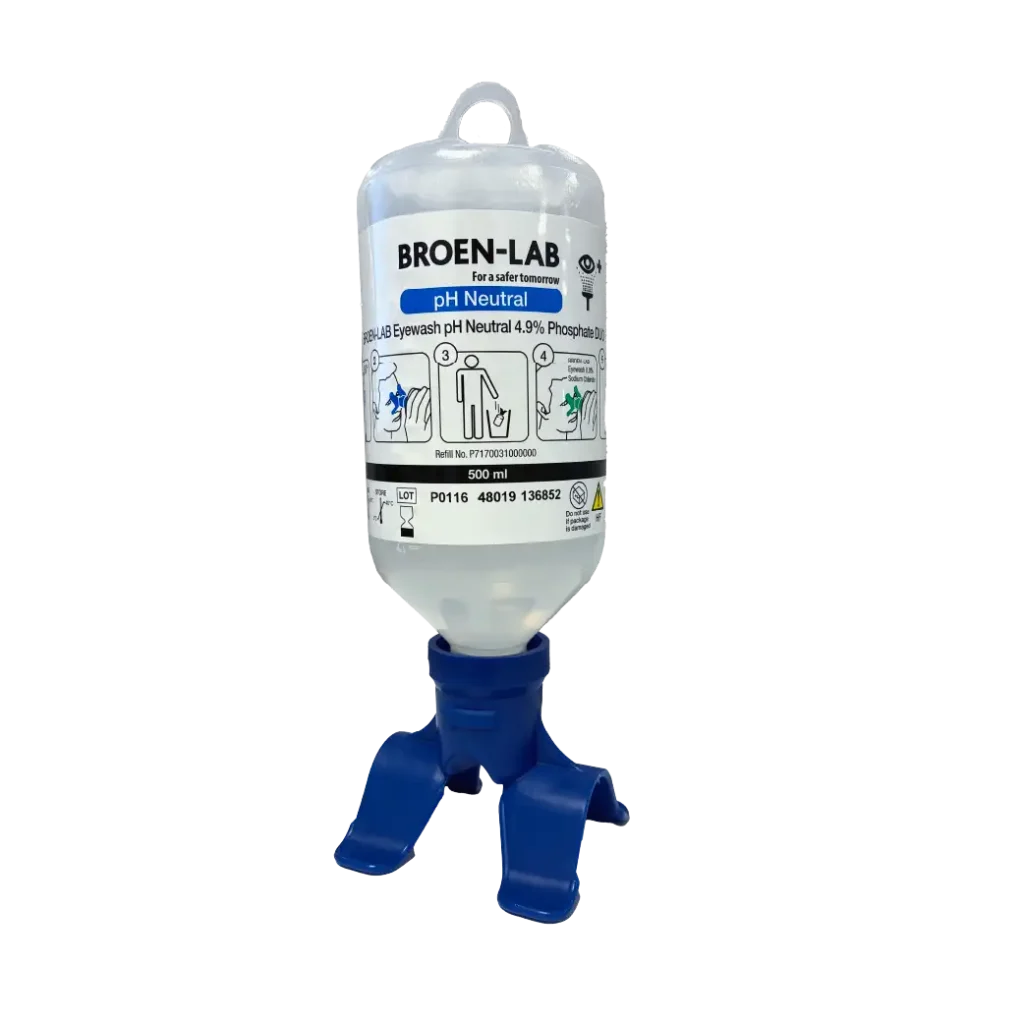 The pH neutral eyewash contains a 4.9% Phosphate solution designed to neutralize acid and base substances and provide effective protection against serious eye injuries. The product features phosphate buffer properties with documented efficacy in chemicals-based eye injuries.